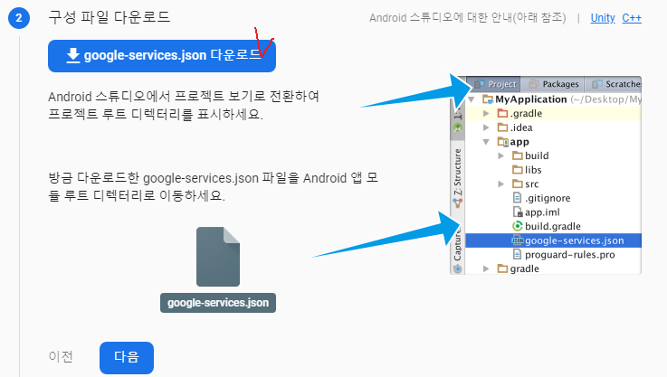 이러한 기능을 사용해주기 위해서 안드로이드 프로젝트에 파이어베이스에 로그인한 계정의 프로젝트와의 연동작업이 필요합니다.