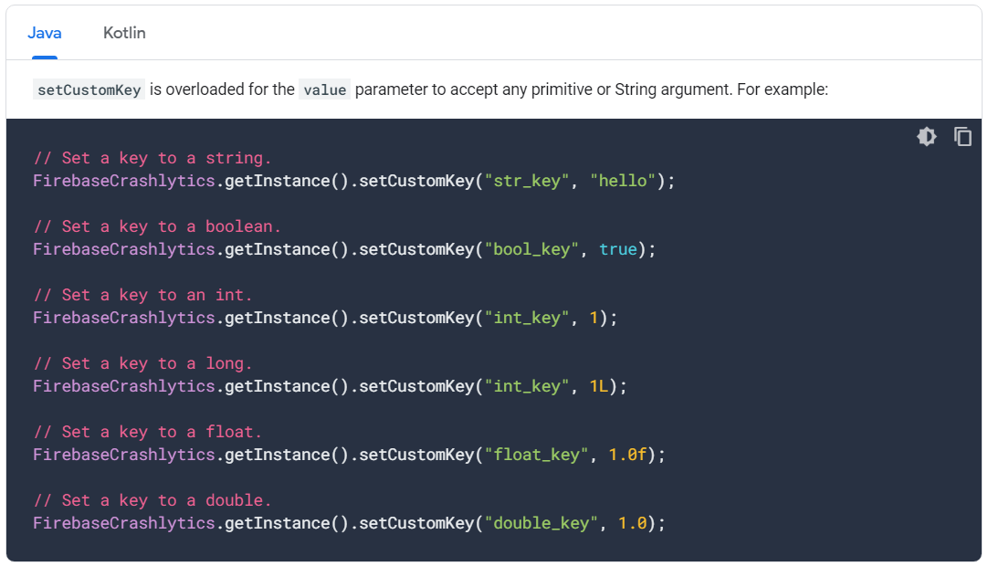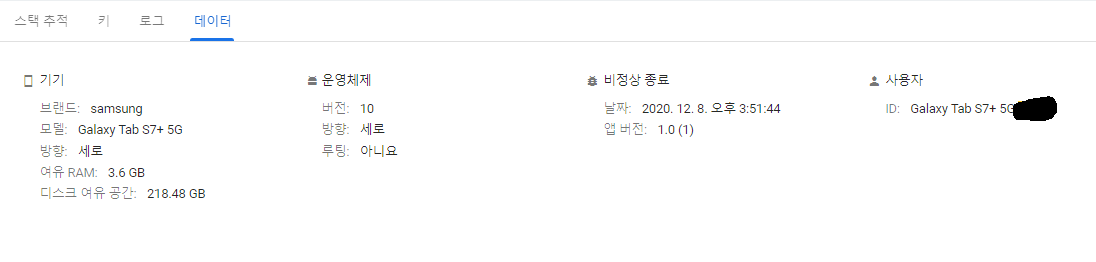 앱 충돌 시 ID를 제외한 추가적인 정보를 알고자 할 경우 원하는 키&값 세팅을 통해서 확인해 볼 수 있습니다.